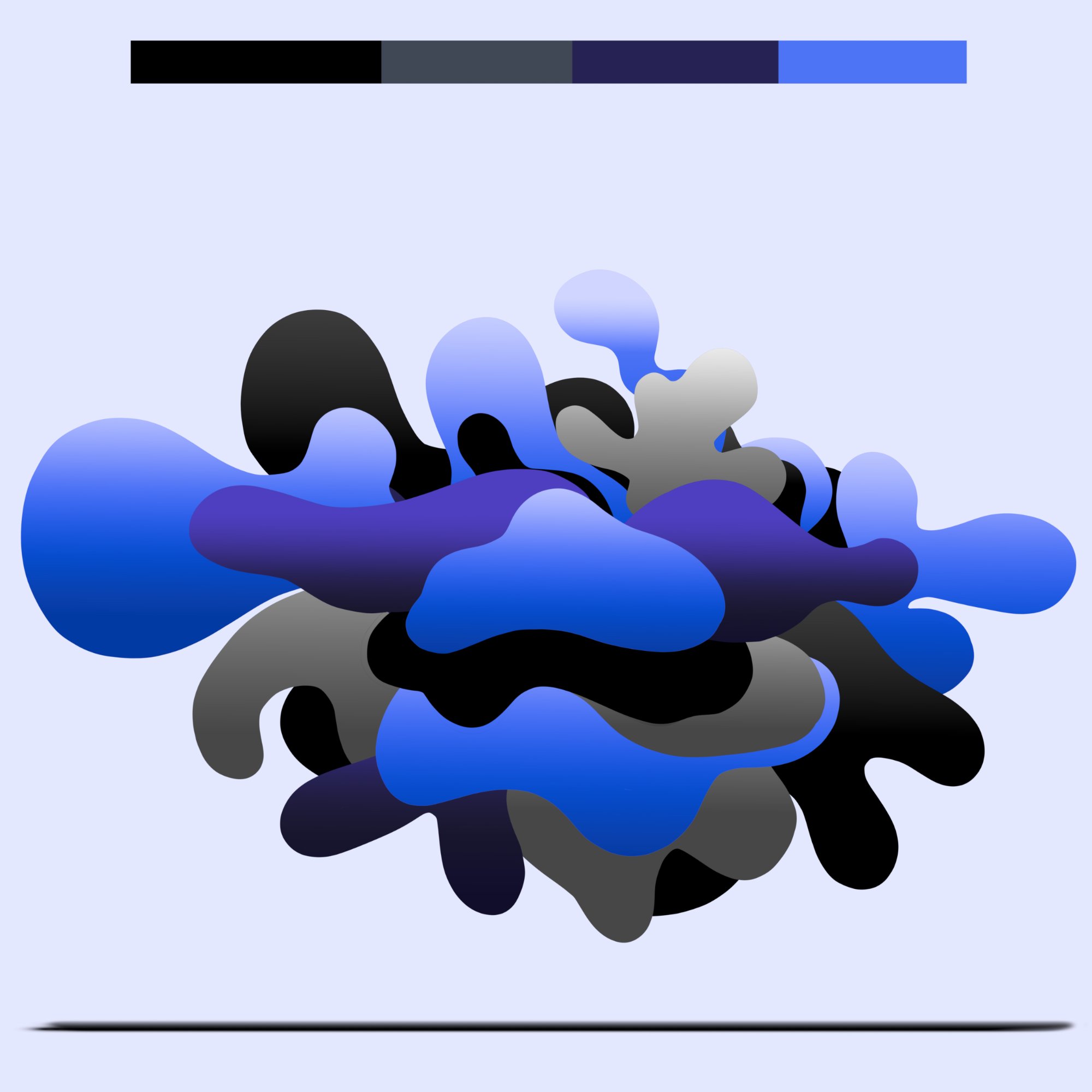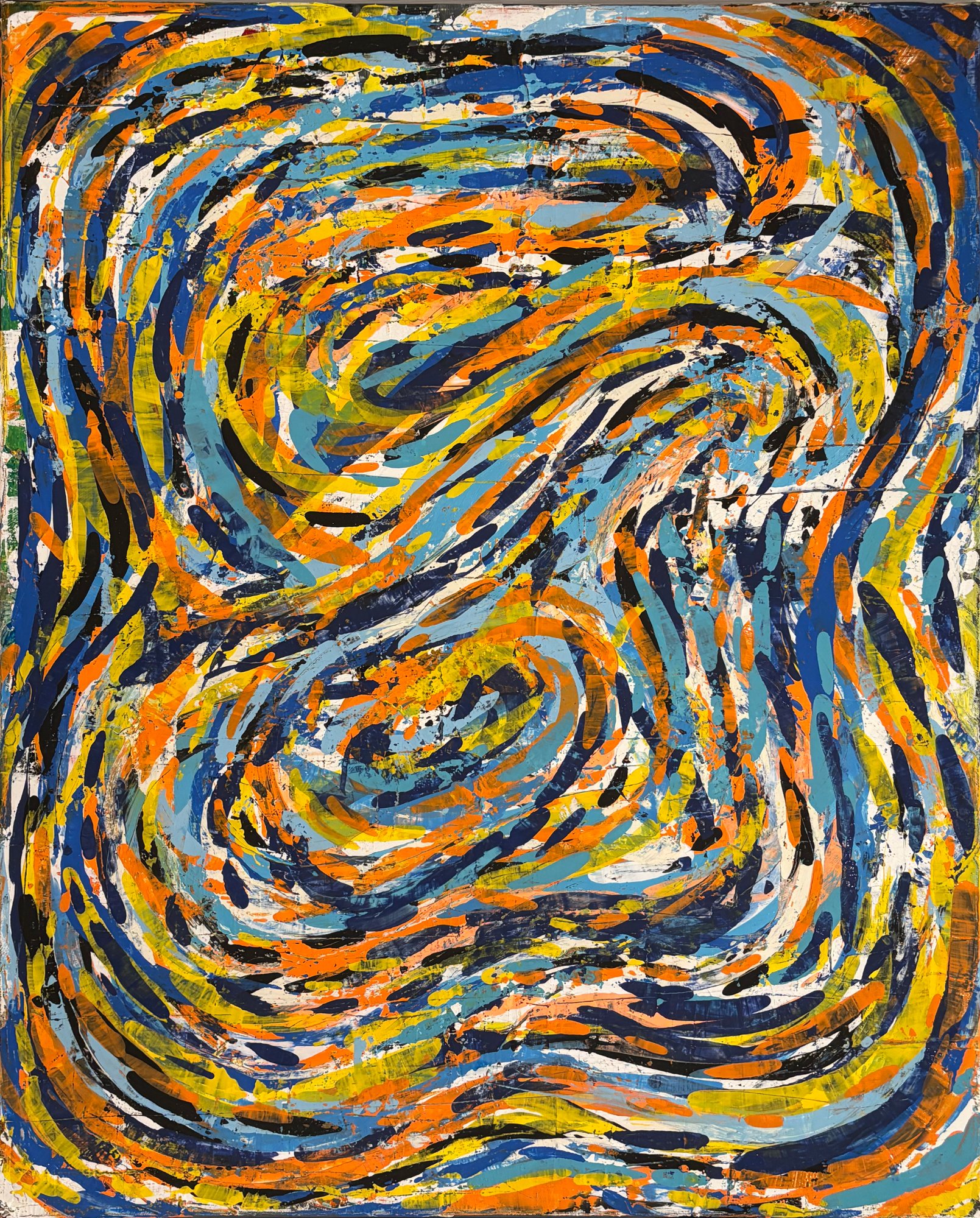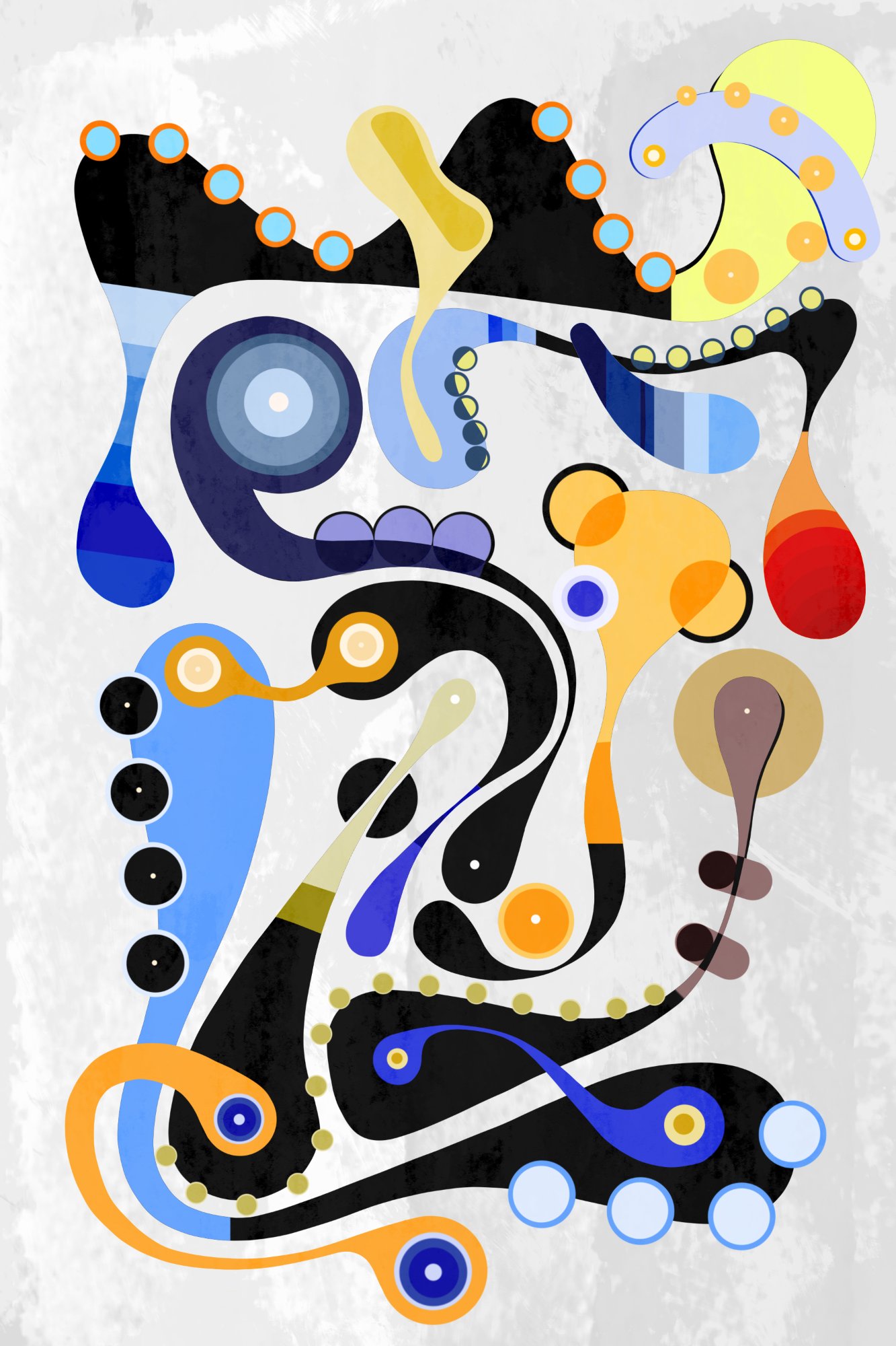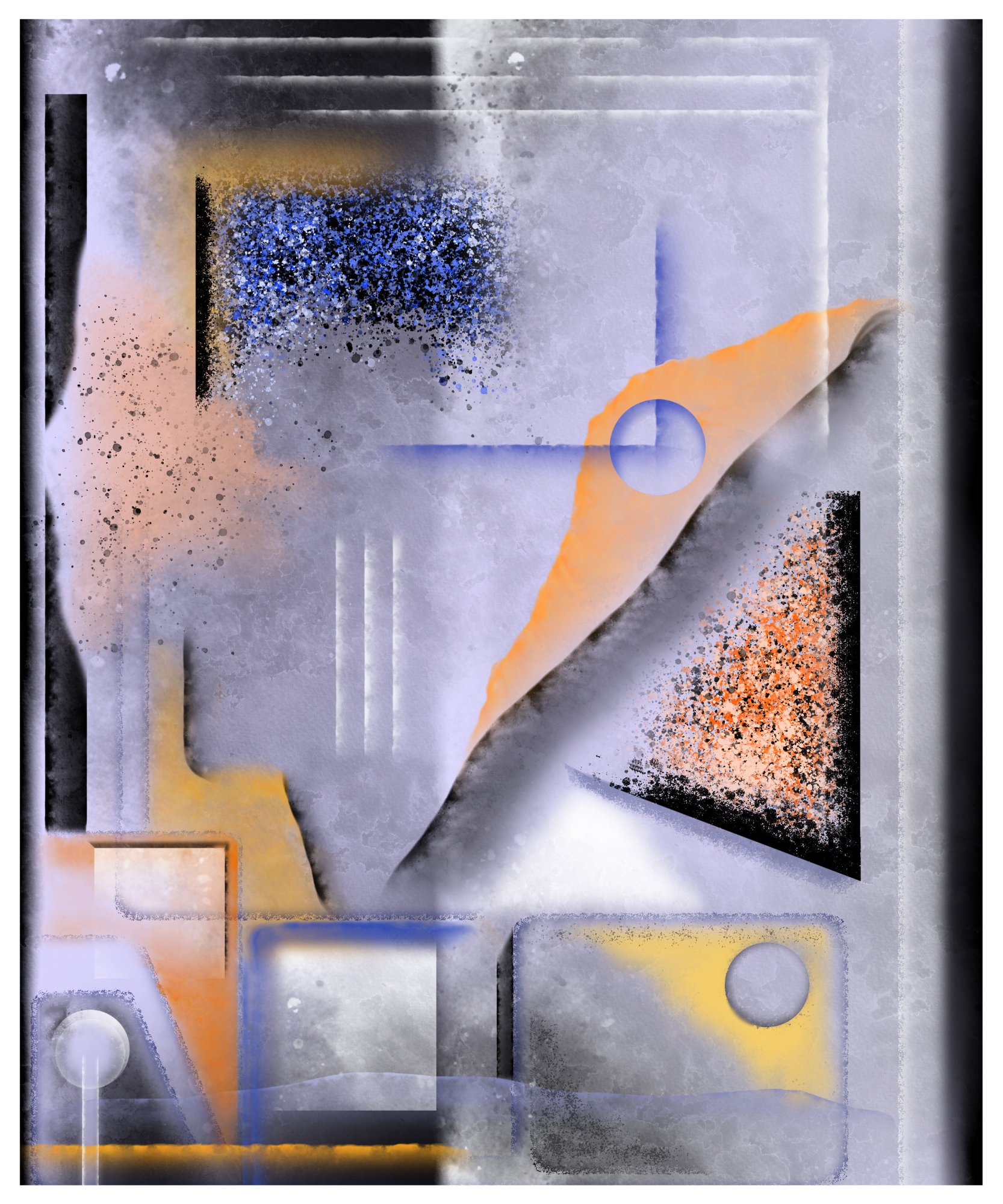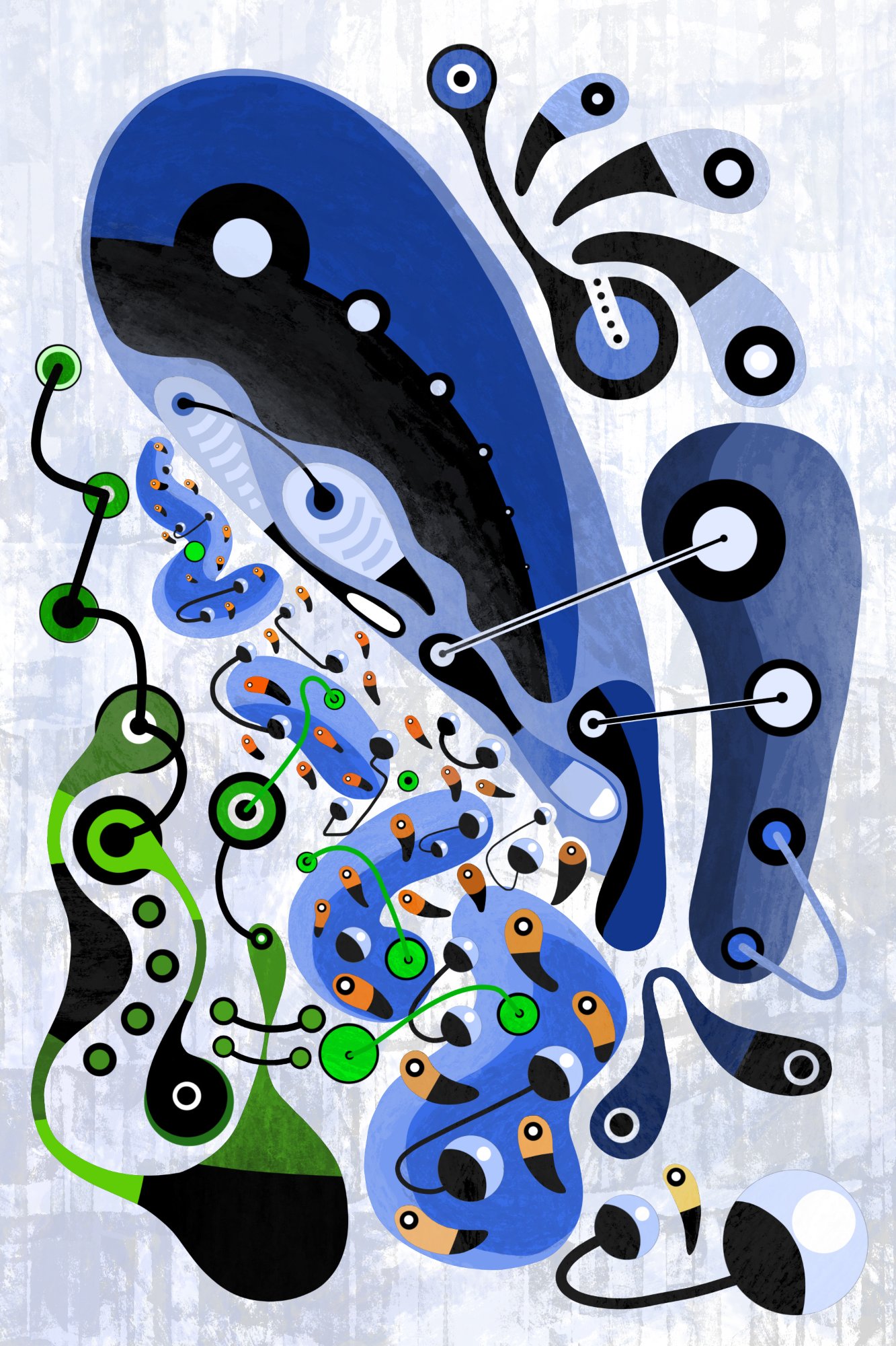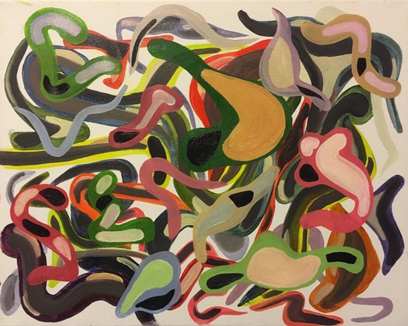 His paintings accumulate through gesture into dense layered fields of energy and form. His digital work explores the architecture of organic shape — structured, intricate, alive. Both practices share a commitment to process: the mark made, the iteration kept, the decision left visible on the surface.