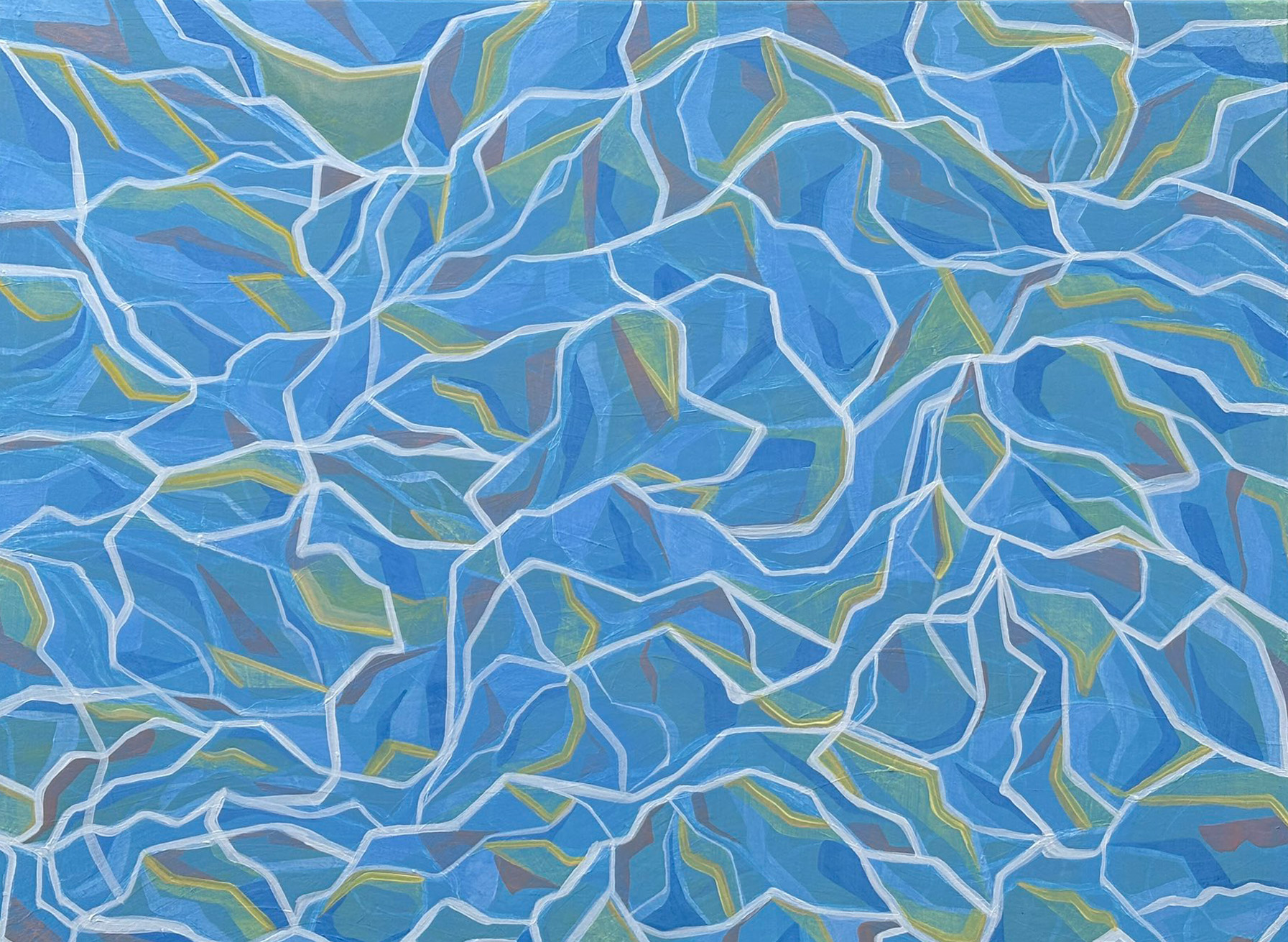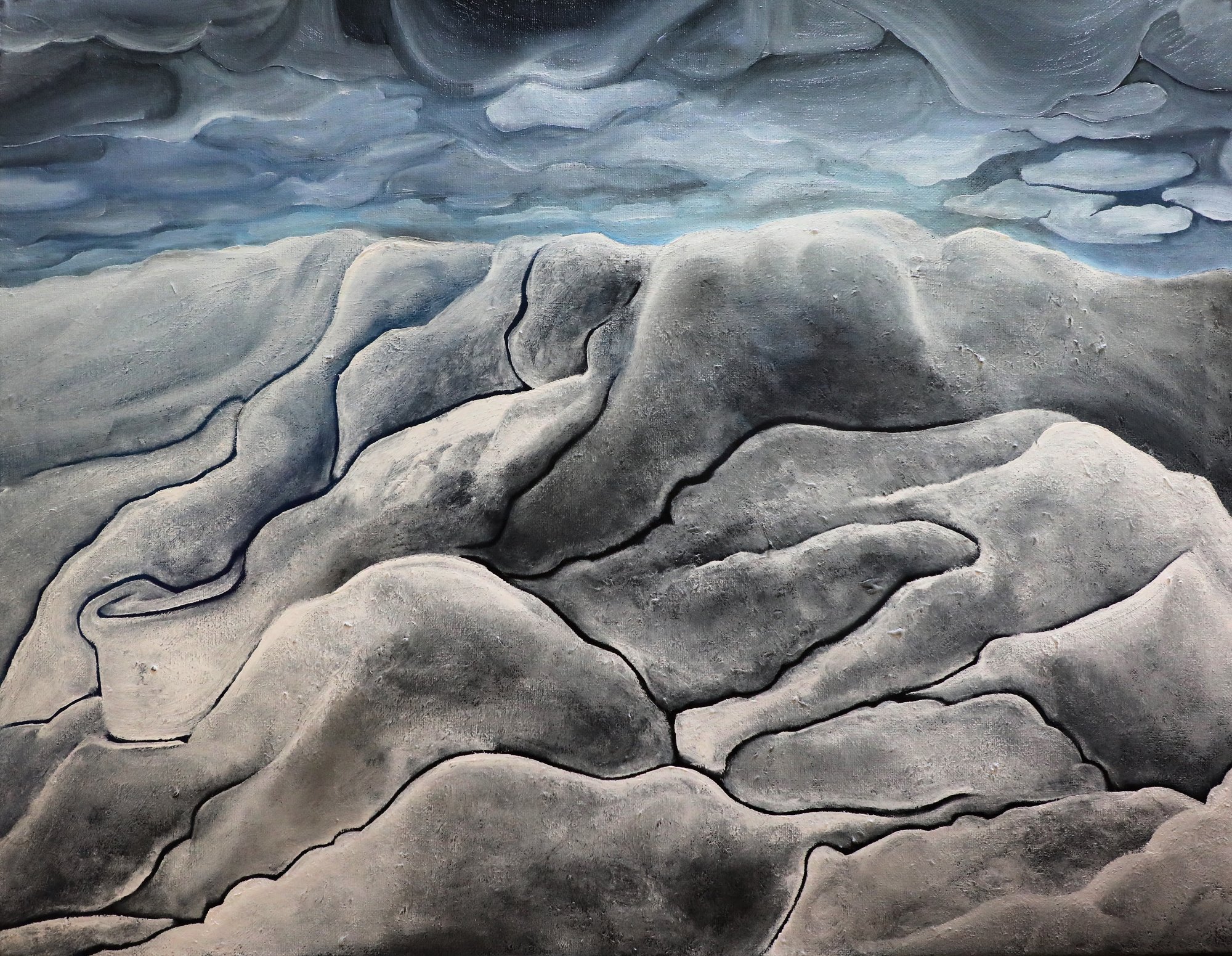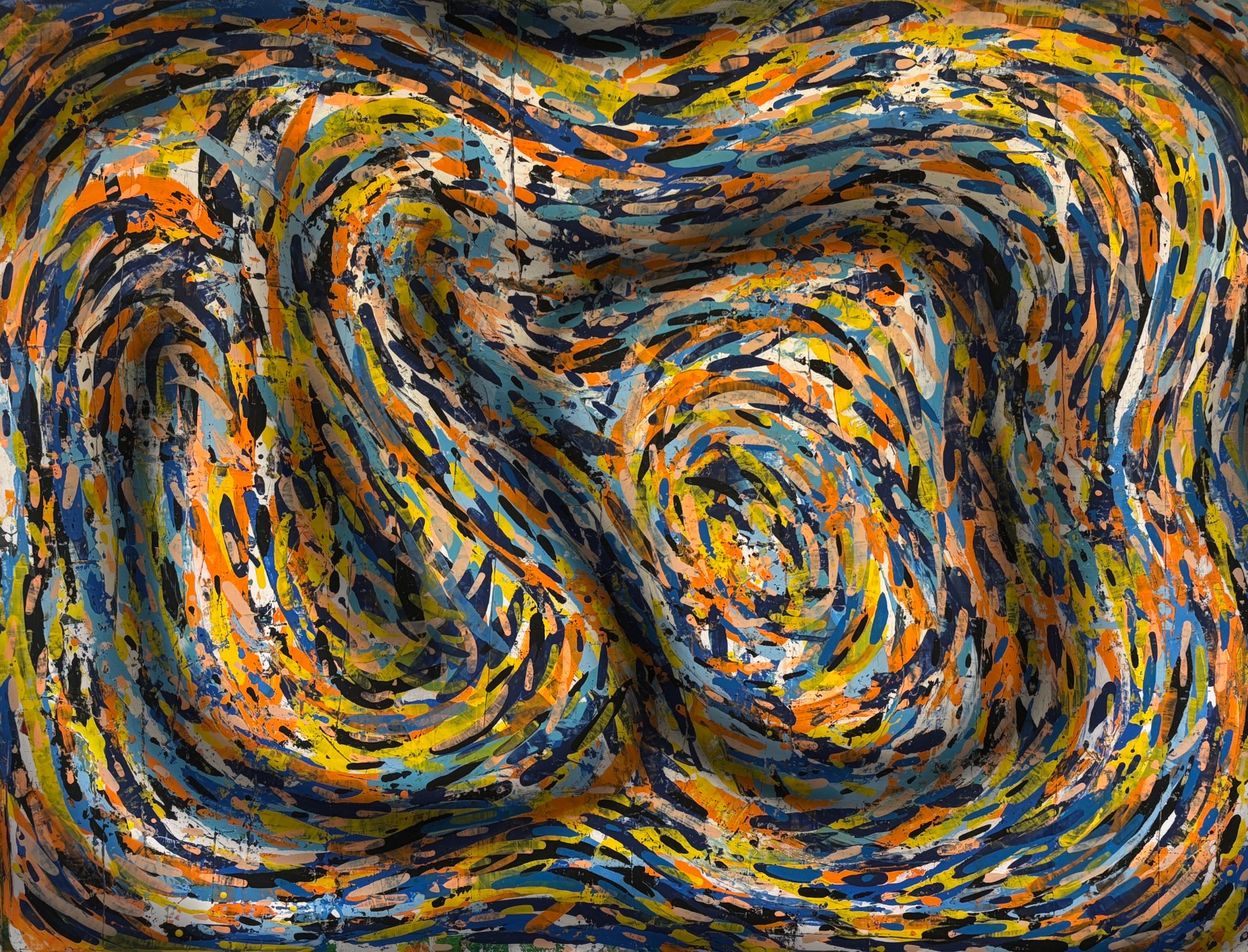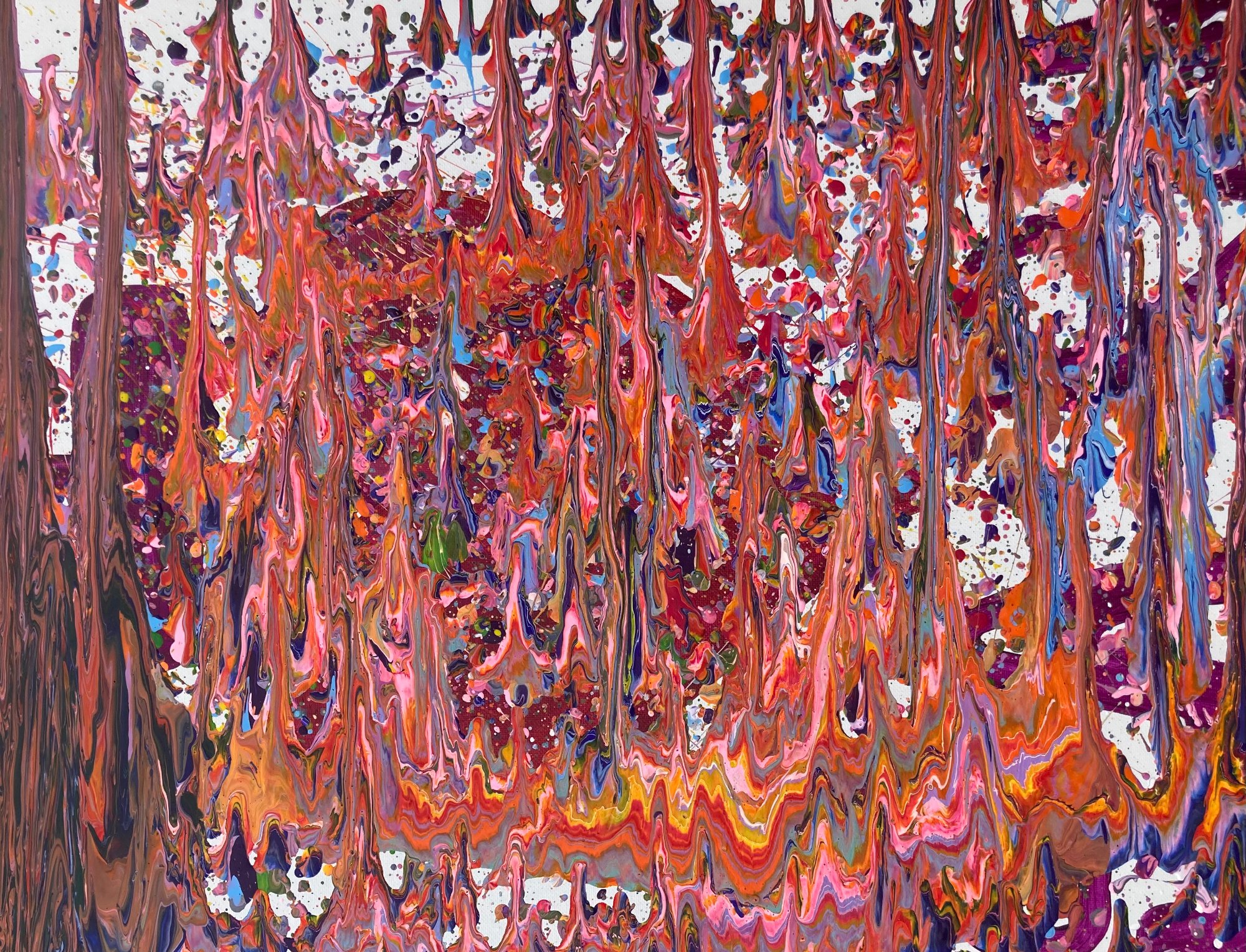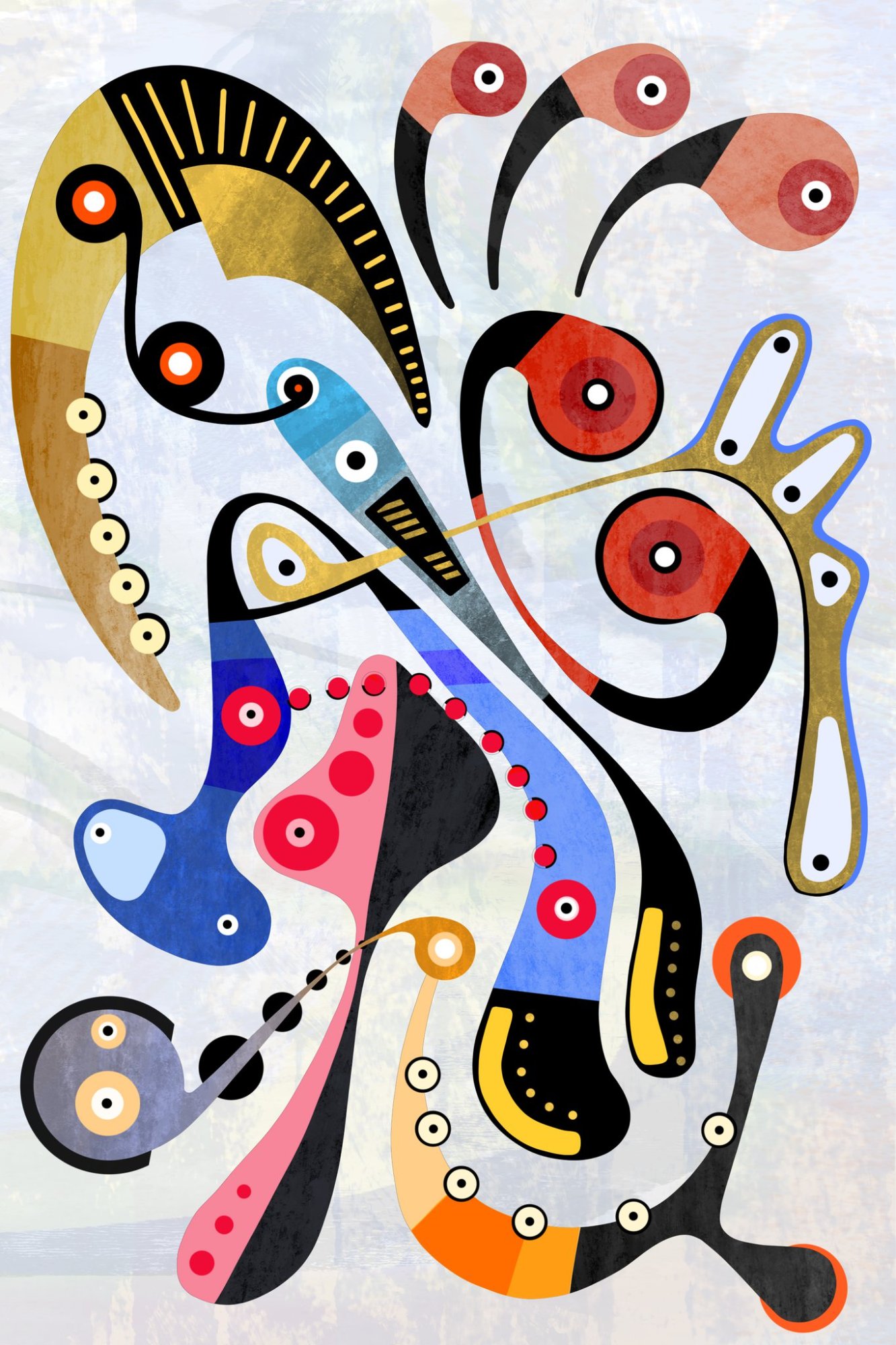 His paintings accumulate through gesture into dense layered fields of energy and form. His digital work explores the architecture of organic shape — structured, intricate, alive. Both practices share a commitment to process: the mark made, the iteration kept, the decision left visible on the surface.