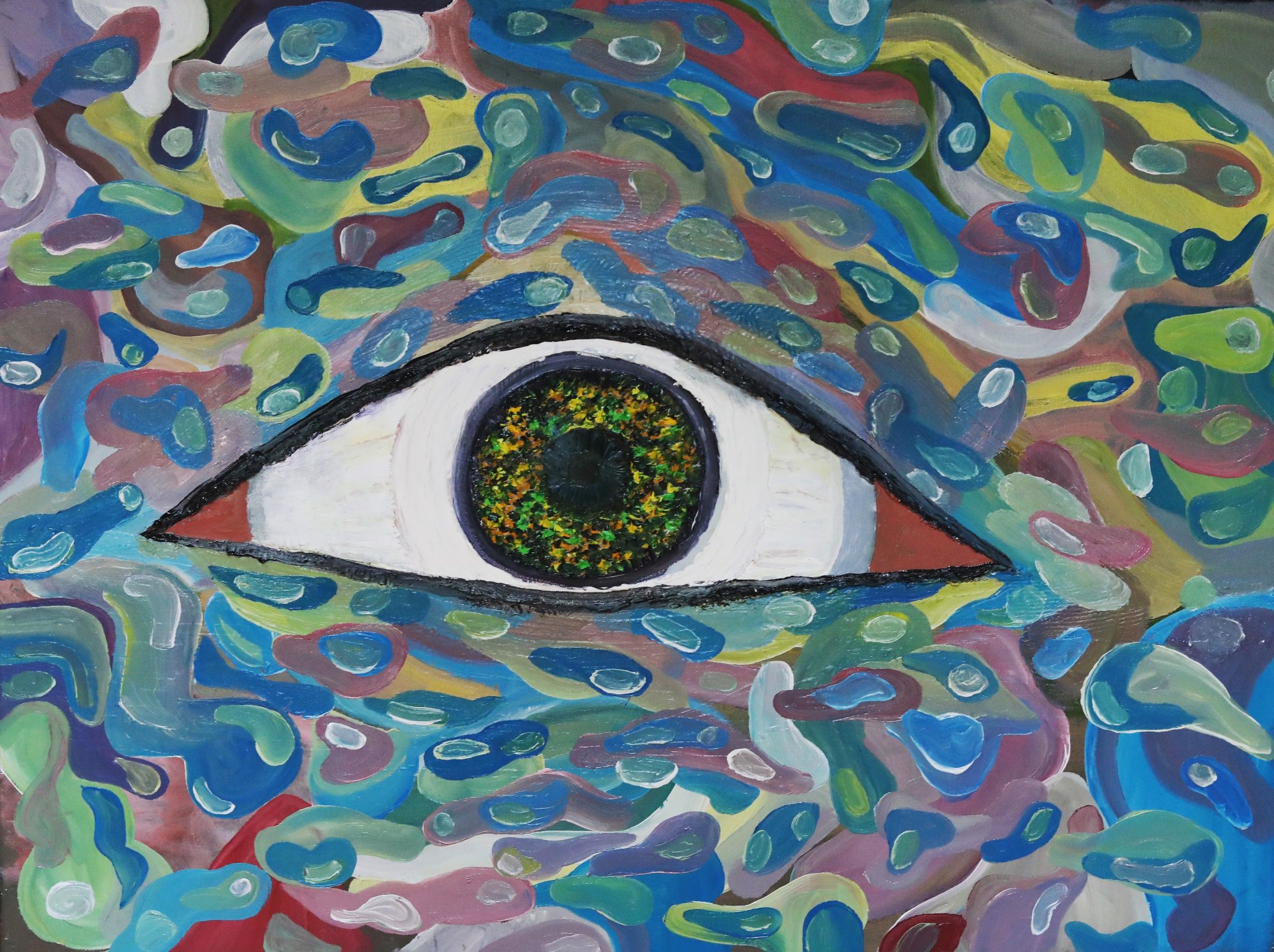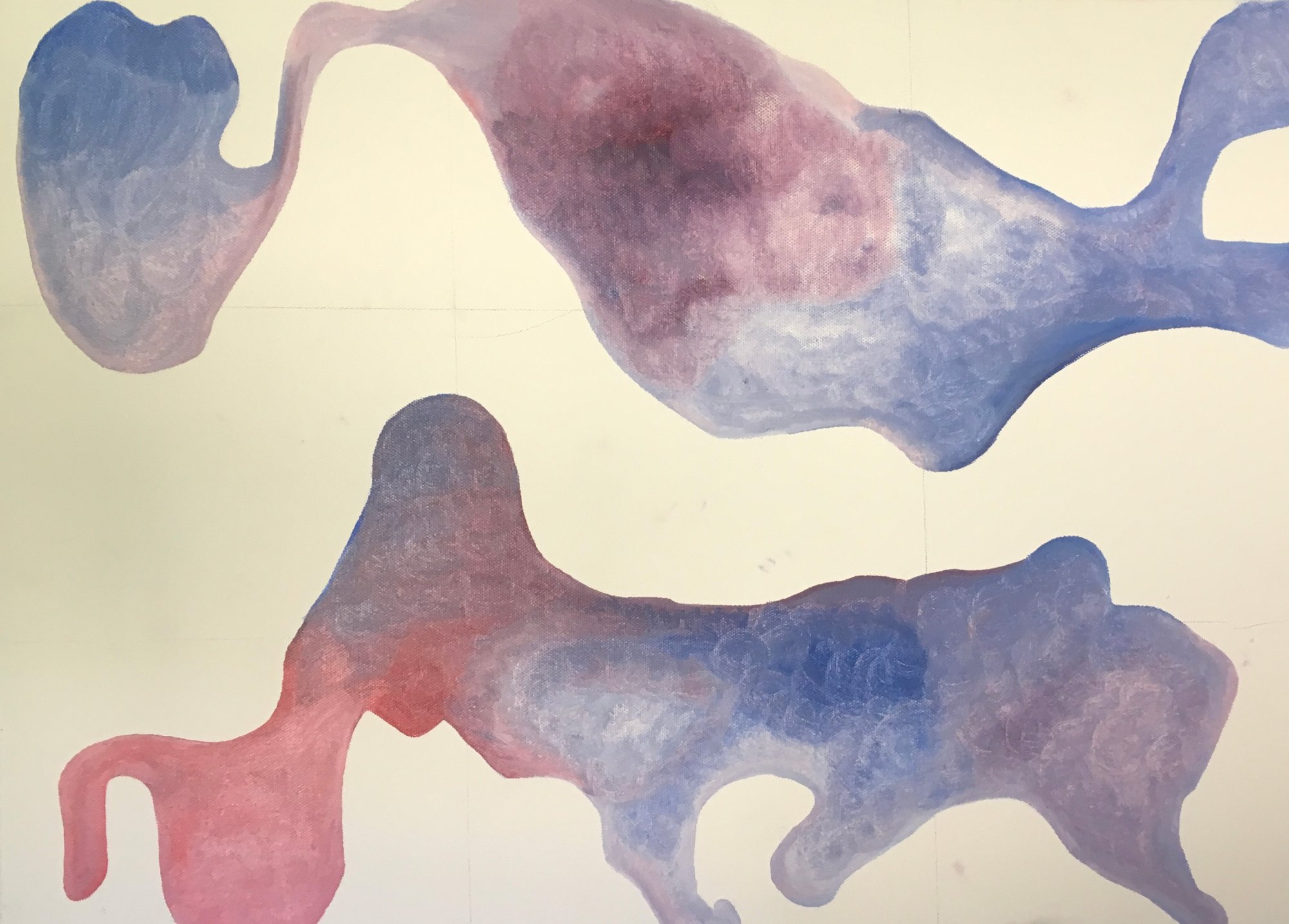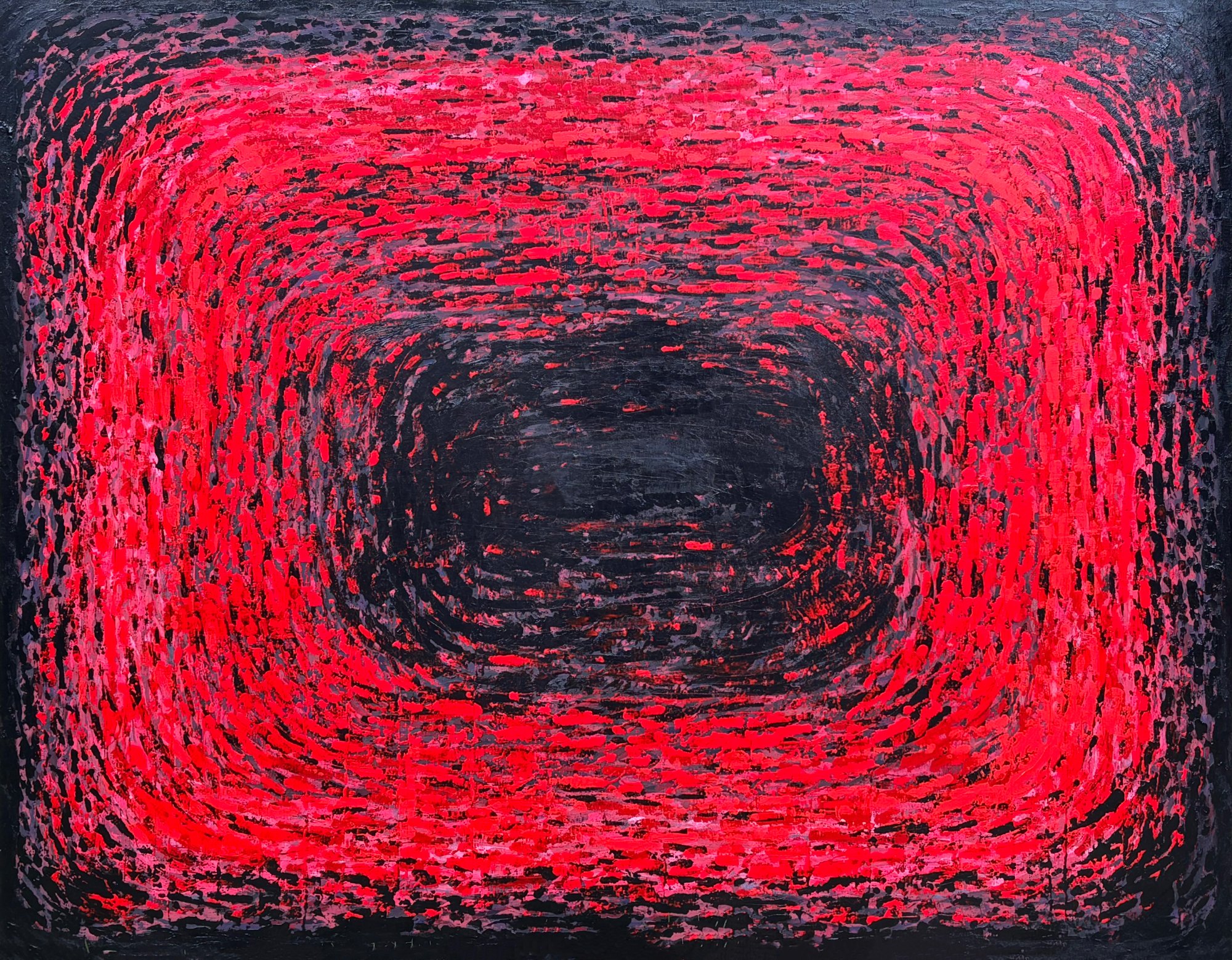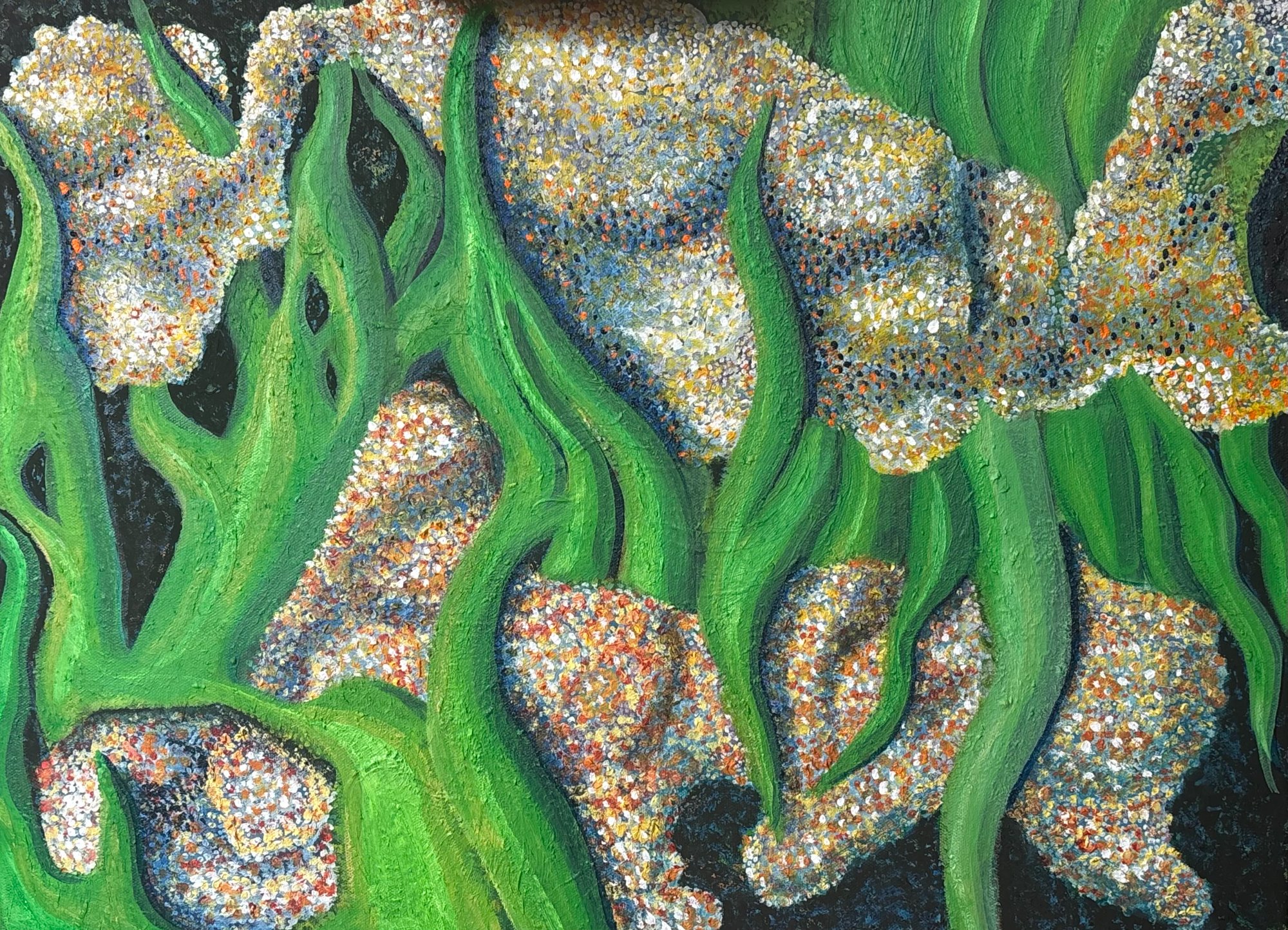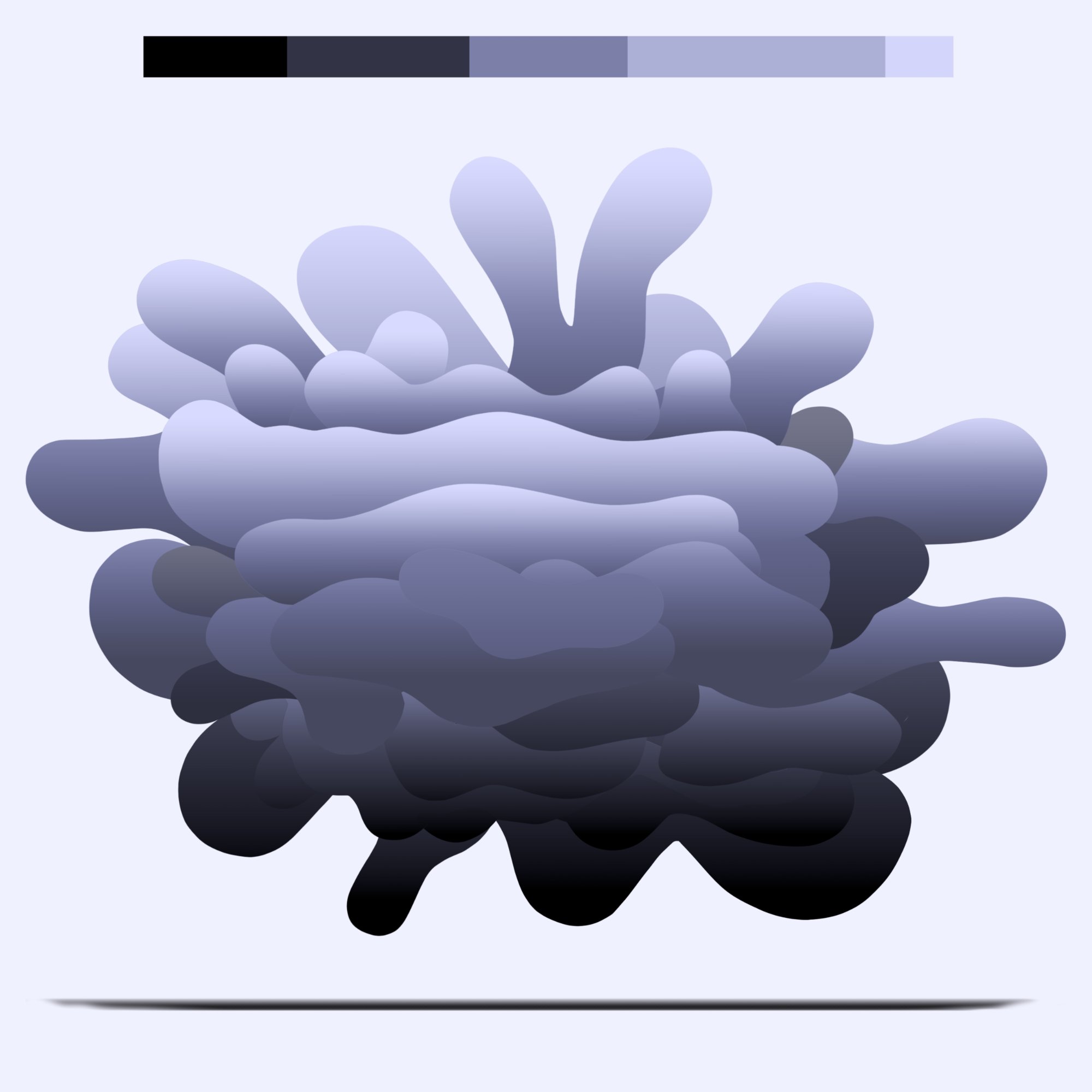 His paintings accumulate through gesture into dense layered fields of energy and form. His digital work explores the architecture of organic shape — structured, intricate, alive. Both practices share a commitment to process: the mark made, the iteration kept, the decision left visible on the surface.